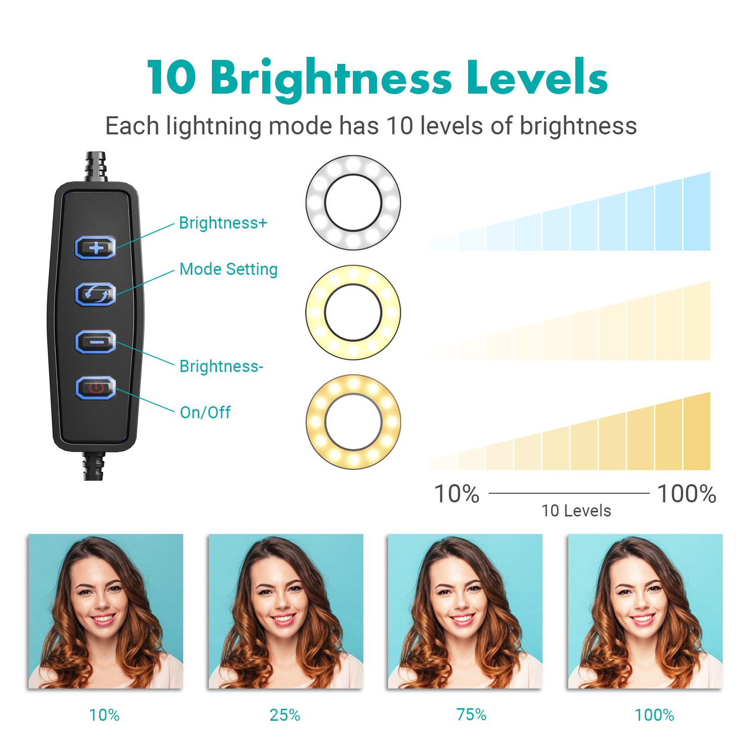 - Adjustable Light Settings: Eliminate harsh shadows and get evenly distributed lighting for your close-up makeup shots with the 3 color, 10 level adjustable selfie LED ring light