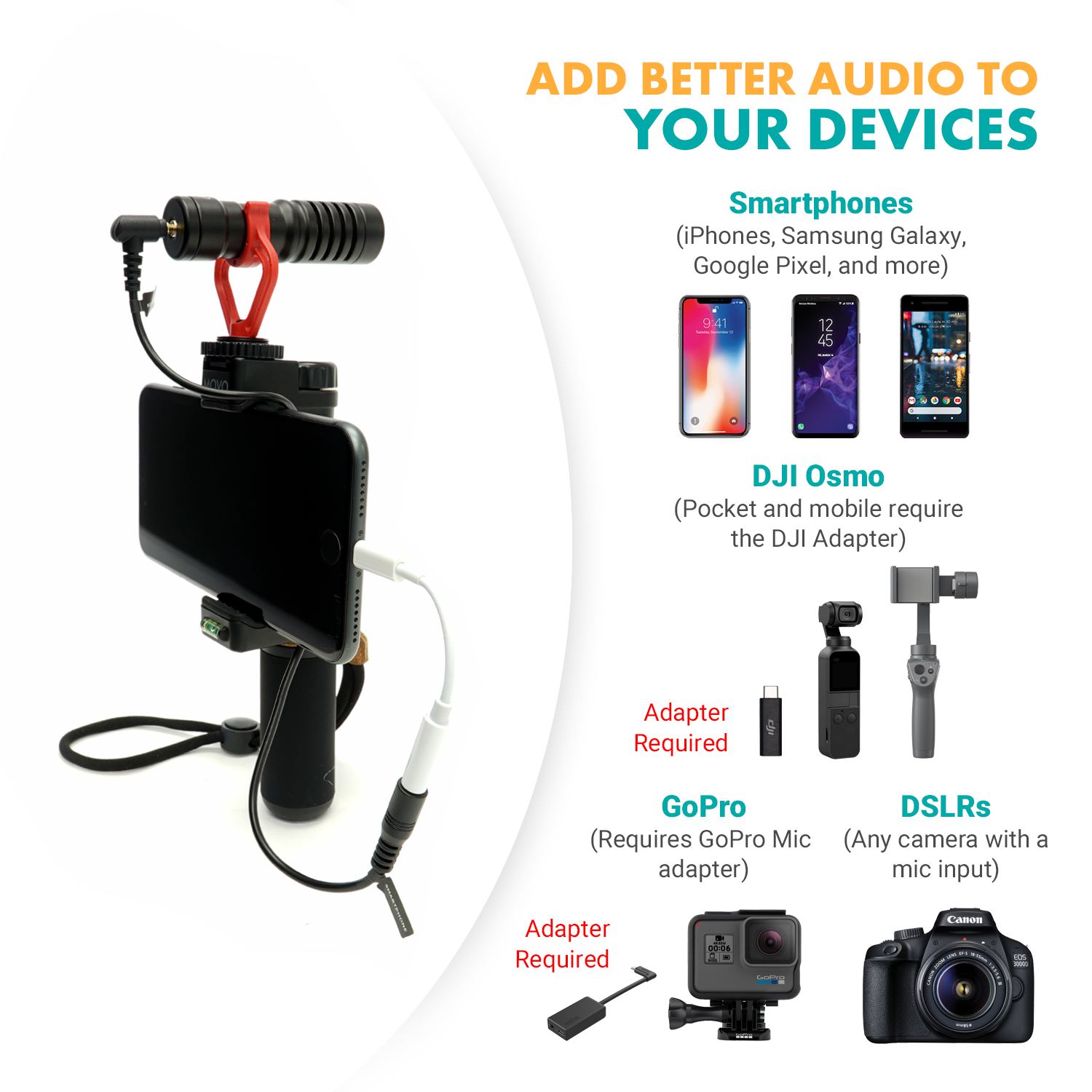 • Universal compatibility - Works with DSLR cameras, camcorders, audio recorders, iPhone and Android smartphones, tablets, and laptops